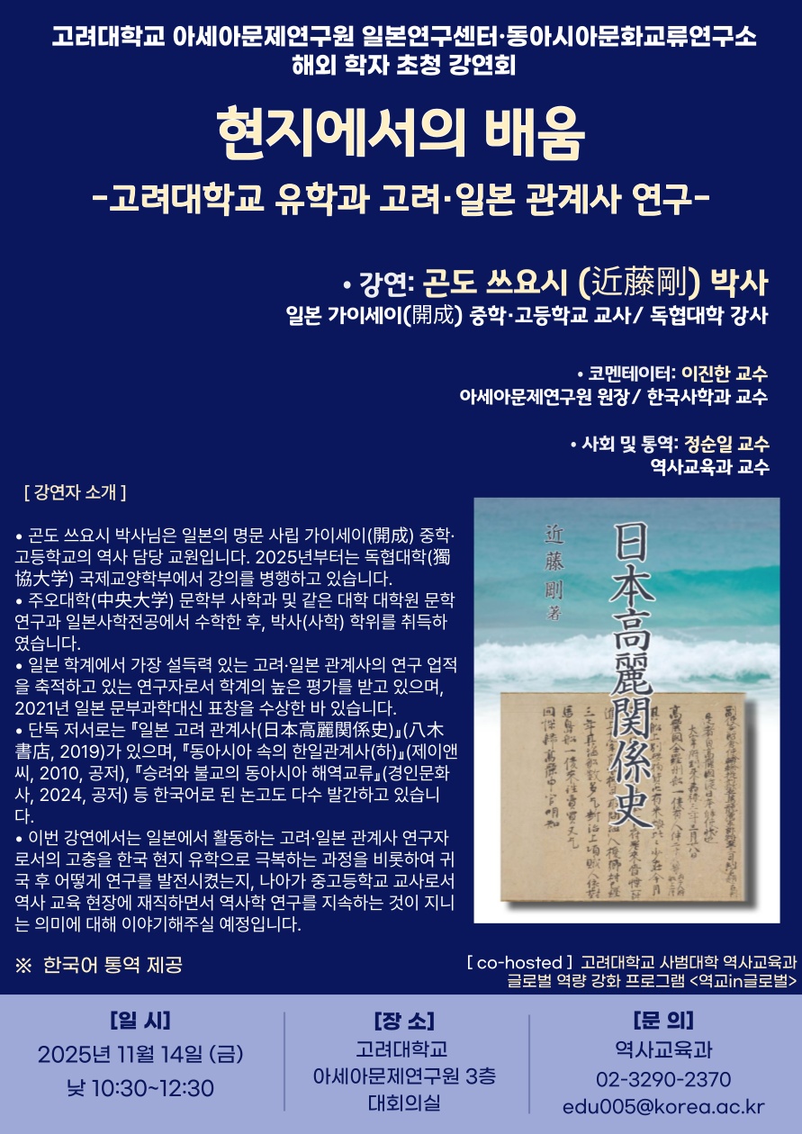 • 이번 강연에서는 일본에서 활동하는 고려·일본 관계사 연구자로서의 고충을 한국 현지 유학으로 극복하는 과정을 비롯하여 귀국 후 어떻게 연구를 발전시켰는지, 나아가 중고등학교 교사로서 역사 교육 현장에 재직하면서 역사학 연구를 지속하는 것이 지니는 의미에 대해 이야기해주실 예정입니다.